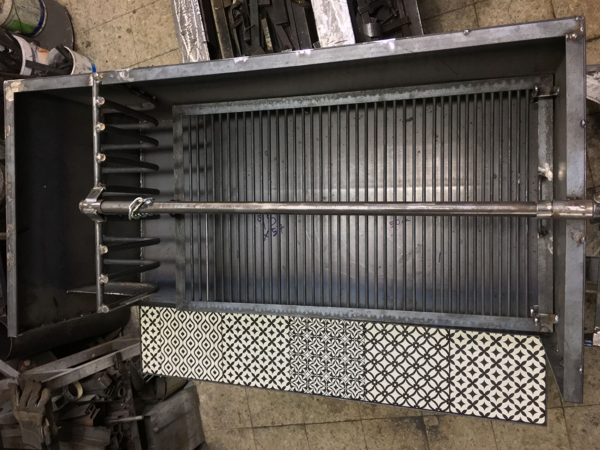 Barbacoa móvil, completa con sistema de parrilla uruguaya, elevación de un solo lado para jugar con la inclinación. Mesada vistosa con terminaciones en azulejo rustico. Ruedas con freno y espacio amplio con suelo.
